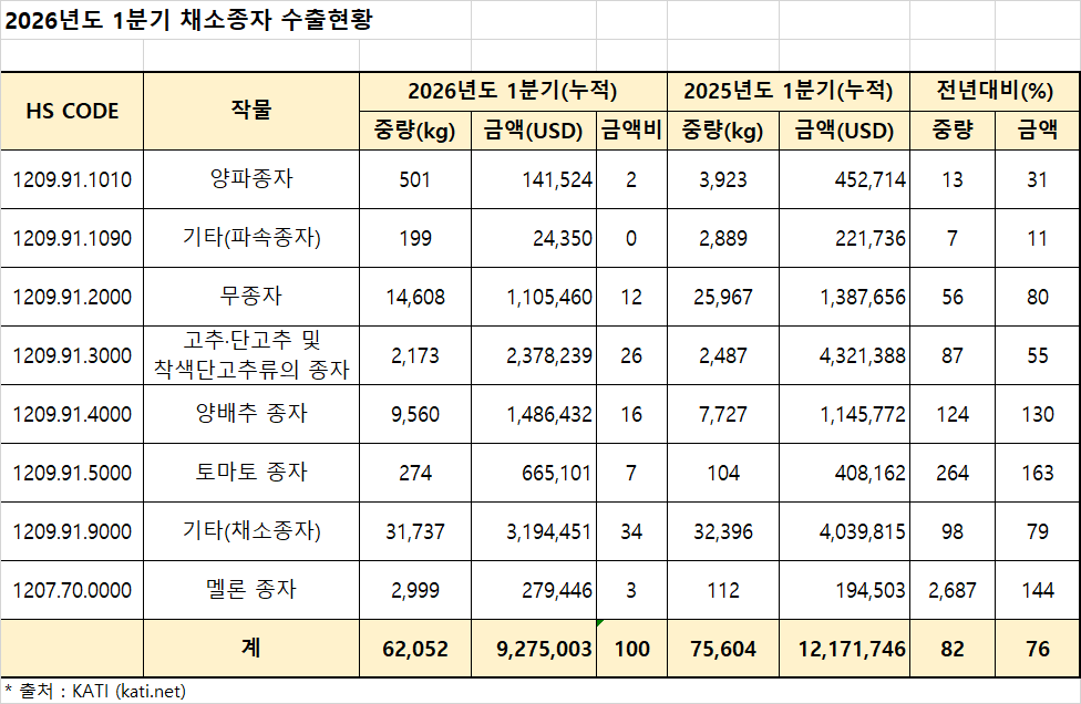 2026년도 1분기 채소종자 수출 현황
