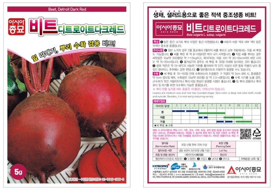 | 비트 | 디트로이트 다크 레드 | 아시아종묘㈜ | 02-443-4303 | 잎 따내기, 뿌리 수확 겸용 비트! |