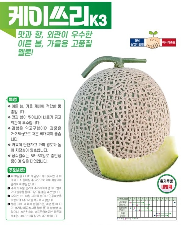 | 멜론 | 케이쓰리 | 아시아종묘㈜ | 02-443-4303 | 맛과 향, 외관이 우수한 이른 봄, 가을용 고품질 멜론! |