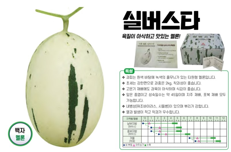 | 멜론 | 실버스타 | 아시아종묘㈜ | 02-443-4303 | 육질이 아삭하고 맛있는 멜론! |