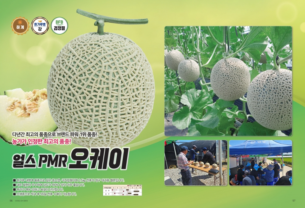 | 멜론 | 얼스PMR오케이 | ㈜경농 | 031-8010-8011 | 네트 발현이 우수하고 당도가 뛰어난 흰가루내병계 조생종 정구 대과 |
