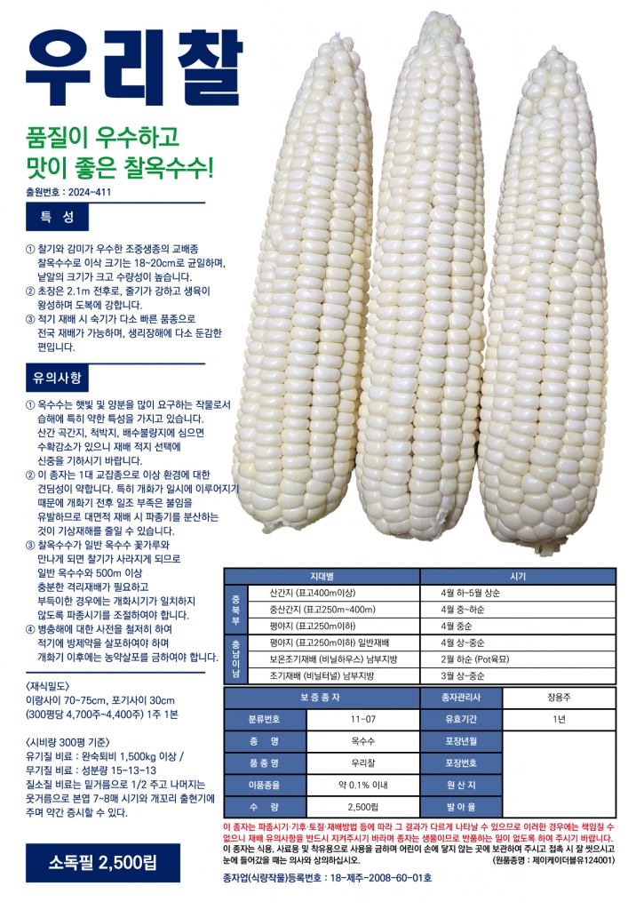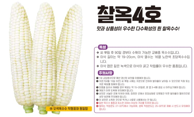 | 주요특성 | 맛있고 통이 큰 다수확용 대한민국 판매 1위 찰옥수수! |