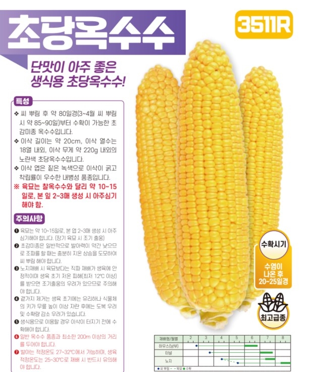 | 옥수수 | 3511R | 아시아종묘㈜ | 02-443-4303 | 단맛이 아주 좋은 생식용 초당옥수수! |