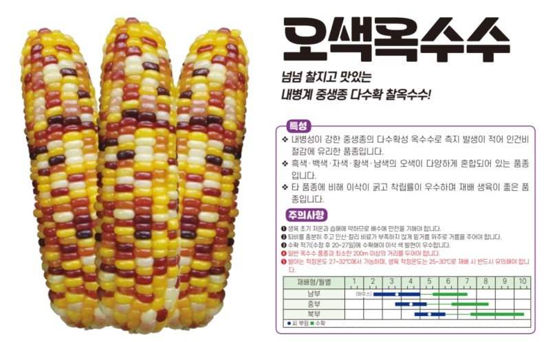 | 옥수수 | 오색옥수수 | 아시아종묘㈜ | 02-443-4303 | 넘넘 찰지고 맛있는 내병계 중생종 다수확 찰옥수수! |