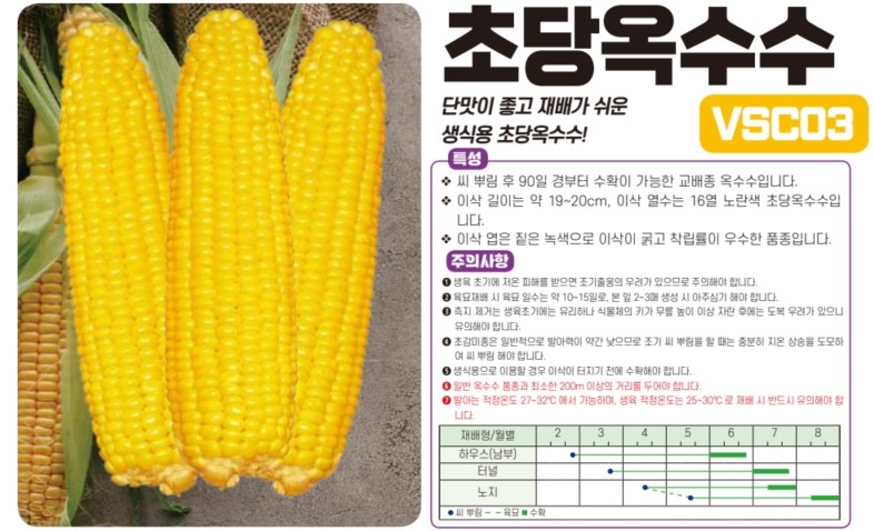 | 옥수수 | VSC03 | 아시아종묘㈜ | 02-443-4303 | 단맛이 좋고 재배가 쉬운 생식용 초당옥수수! |