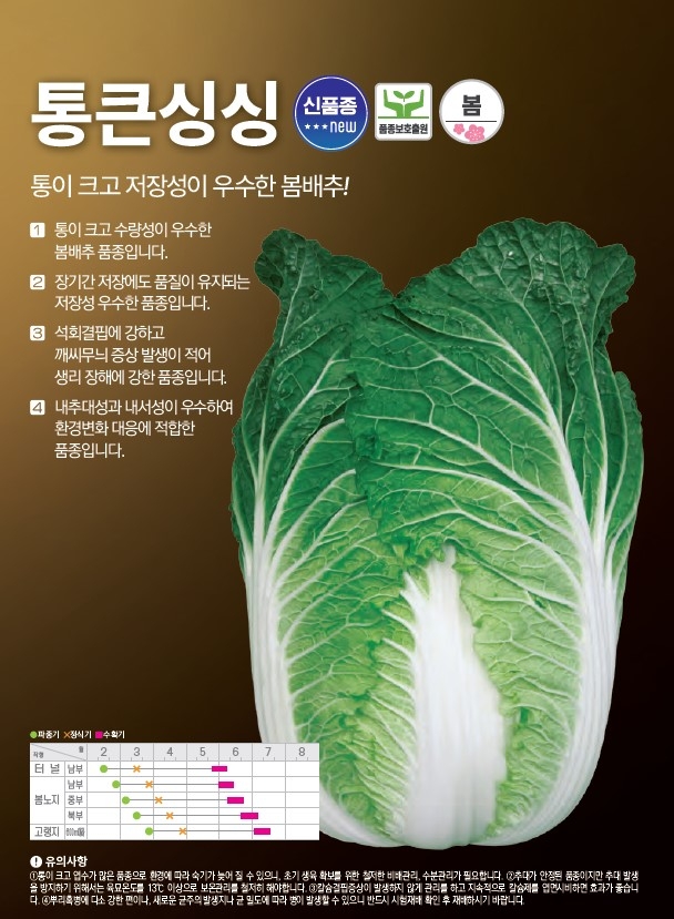 | 배추 | 통큰싱싱 | ㈜팜한농 | 1644-0901 | 통이 크고 저장성시 우수한 봄배추! |