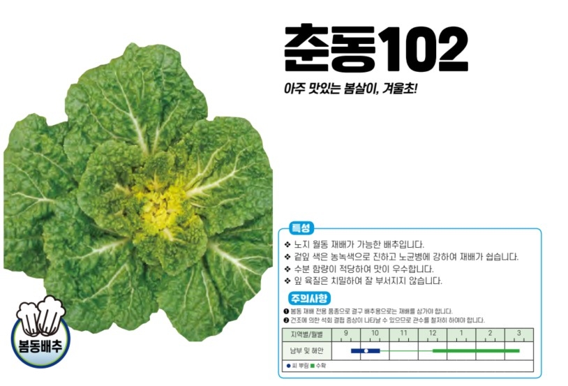 | 배추 | 춘동102 | 아시아종묘㈜ | 02-443-4303 | 아주 맛있는 봄살이, 겨울초! |