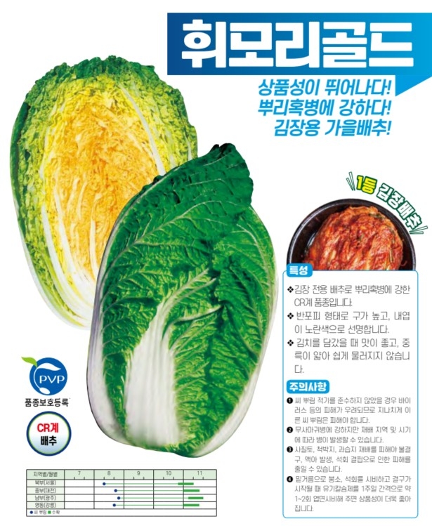 | 배추 | 휘모리골드 | 아시아종묘㈜ | 02-443-4303 | 상품성이 뛰어나다! 뿌리혹병에 강하다! 김장용 가을배추! |