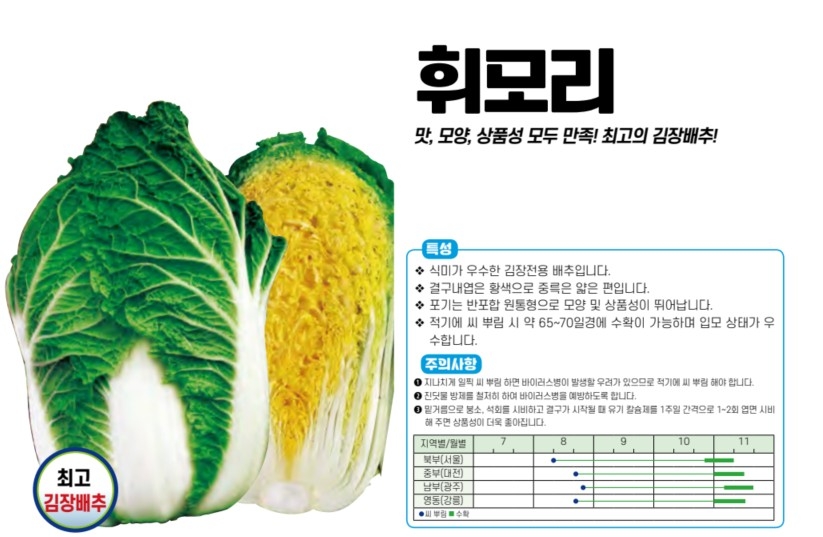 | 배추 | 휘모리 | 아시아종묘㈜ | 02-443-4303 | 맛, 모양, 상품성 모두 만족! 최고의 김장배추! |