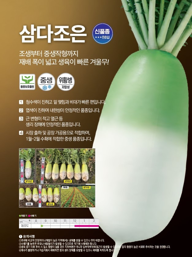 | 무 | 삼다조은 | ㈜팜한농 | 1644-0901 | 조생부터 중생작형까지 재배 폭이 넓은 겨울무! |