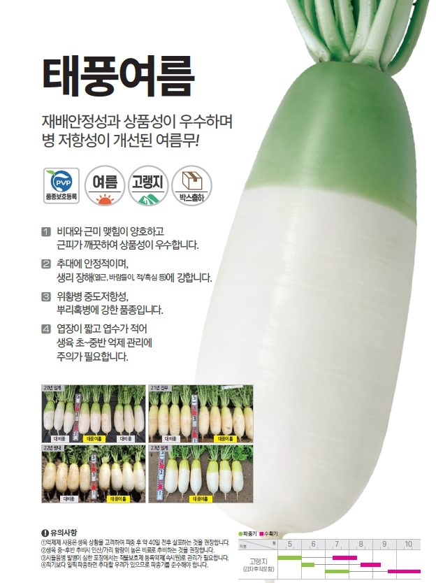 | 무 | 태풍여름 | ㈜팜한농 | 1644-0901 | 재배 안정성과 상품성이 우수하고 병 저항성이 개선된 여름무! |