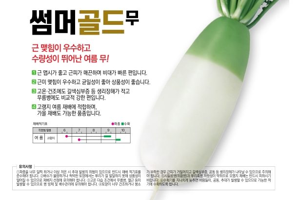 | 무 | 썸머골드 | 바이오통크랍사이언스㈜ | 031-994-4199 | 근 맺힘이 우수하고 수량성이 뛰어난 여름 무 |