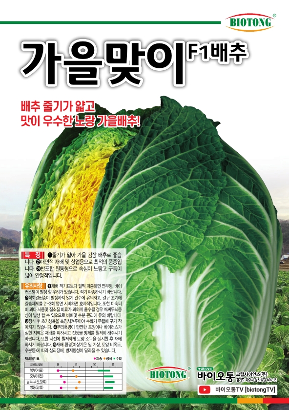 | 주요특성 | 뿌리혹병에 강해 재배가 용이하며 맛좋은 노란색 고품질 가을 김장배추 |