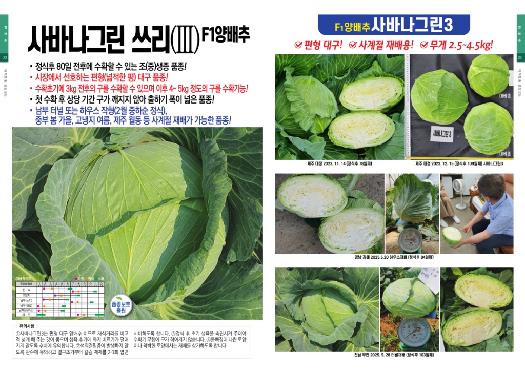 | 양배추 | 사바나그린3 | 바이오통크랍사이언스㈜ | 031-994-4199 | 편형 대구, 사계절 재배용 |