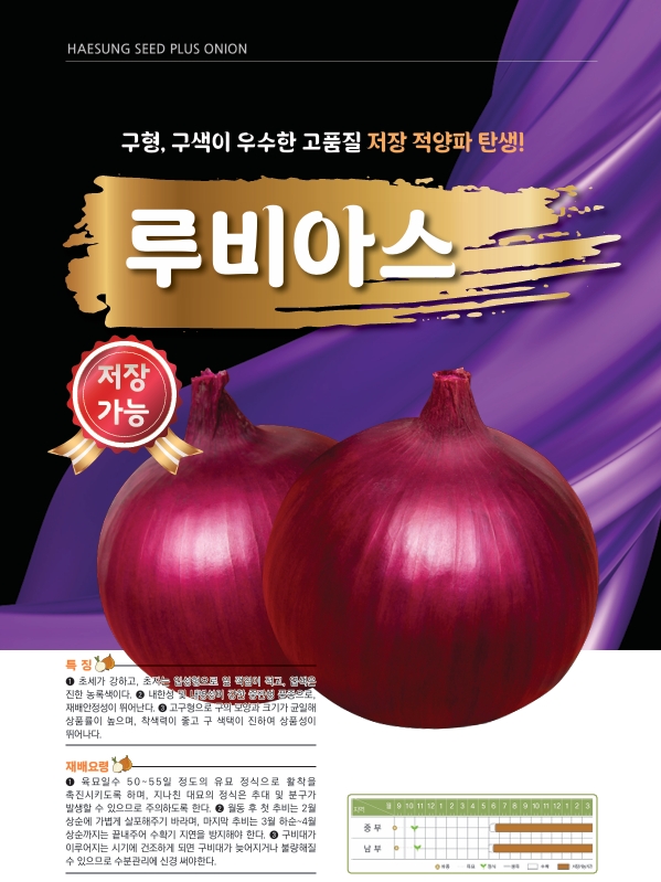 | 양파 | 루비아스 | 해성씨드플러스㈜ | 051-973-9697 | 구형, 구색이 우수한 고품질 저장 적양파 탄생! |