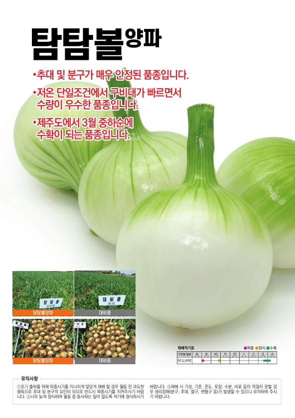 | 양파 | 비스트 | ㈜제농S&T | 010-8506-0809 | 내한성이 강하고 상품성, 저장성 최고인 중만생 양파(국내육성) |
