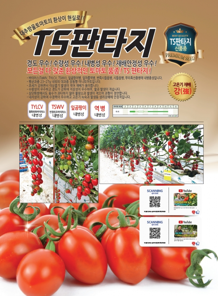 | 주요특성 | 경도 우수! 수량성 우수! 내병성 우수! 재배안정성 우수! 모든걸 다 갖춘 환상적인 토마토 품종! TS 판타지! |
