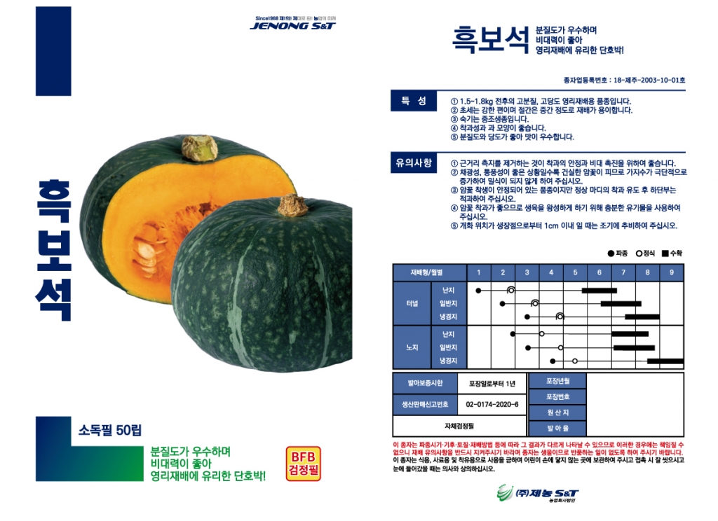 | 호박 | 흑보석 | ㈜제농S&T | 010-8506-0809 | 분질도가 우수하며, 비대력이 좋아 영리재배에 유리한 단호박! |