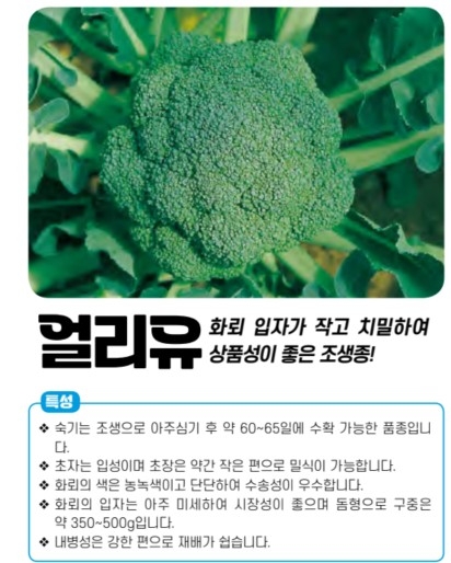 | 주요특성 | 매우 균일한 극조생 브로콜리, 준 고랭지, 고랭지, 봄, 여름 재배에 적합 |