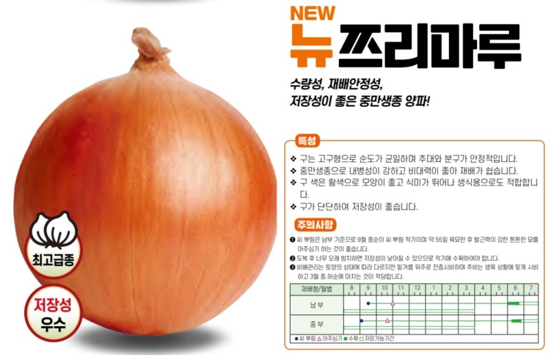 | 양파 | 뉴쯔리마루 | 아시아종묘㈜ | 02-443-4303 | 수량성, 재배안정성, 저장성이 좋은 중만생종 양파! |