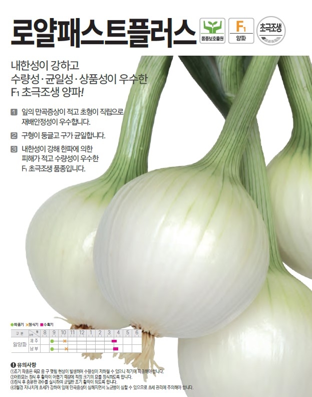 | 양파 | 로얄패스트플러스 | ㈜팜한농 | 1644-0901 | 순도를 높여 내한성이 강하고 수량성·균일성도 우수한 F₁ 초극조생 양파! |