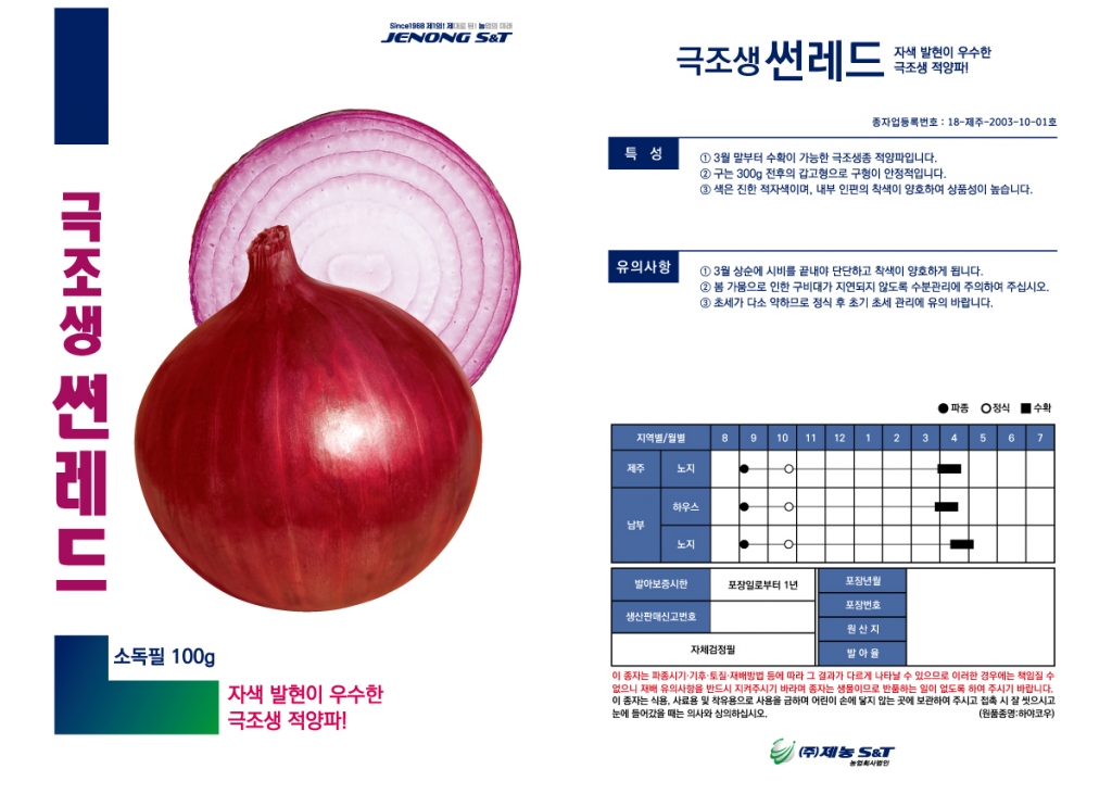 | 양파 | 극조생썬레드 | ㈜제농S&T | 010-8506-0809 | 자색 발현이 우수한 극조생 적양파! |