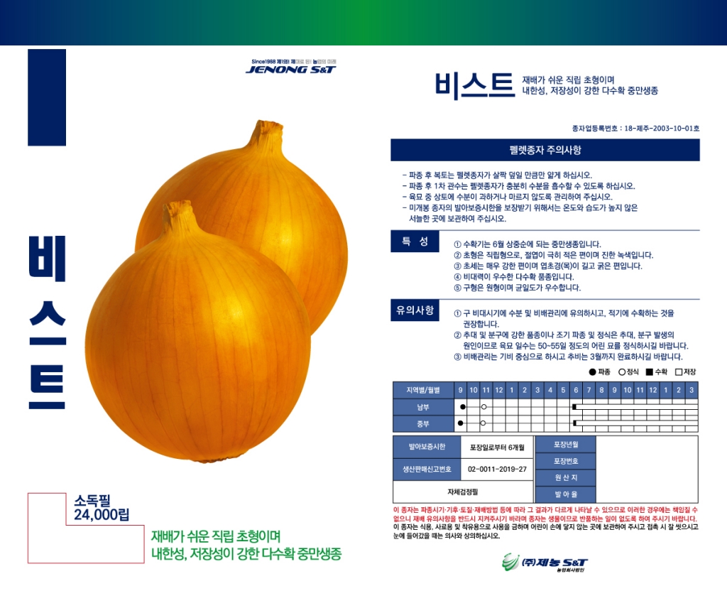 | 양파 | 비스트 | ㈜제농S&T | 010-8506-0809 | 초형이 직립형이어서 재배관리가 용이! 내한성이 강하고 수량성과 저장성까지 우수한 중만생 양파! |