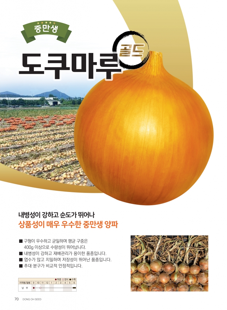 | 양파 | 도쿠마루골드 | ㈜경농 | 031-8010-8011 | 내병성이 강하고 순도가 뛰어나 상품성이 매우 우수한 중만생 |