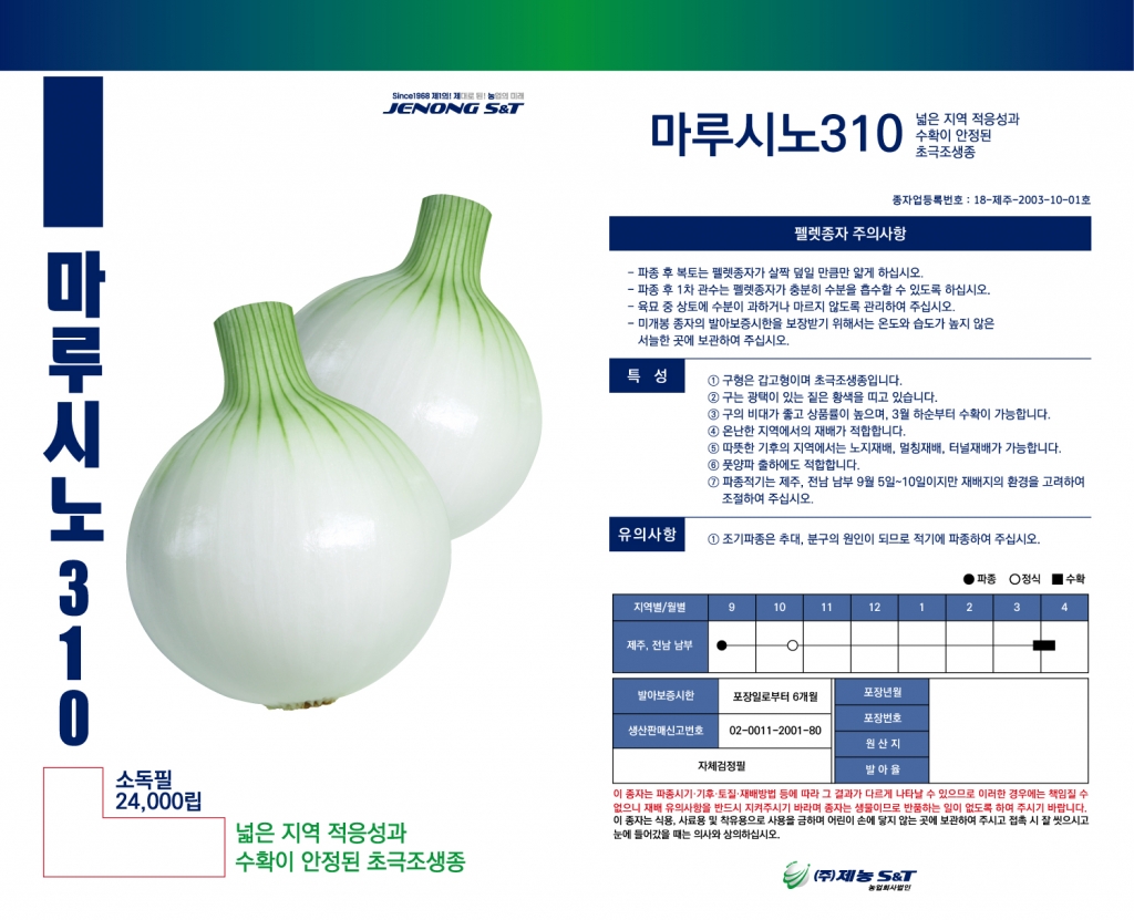 | 양파 | 마루시노310 | ㈜제농S&T | 010-8506-0809 | 넓은 지역 적응성과 수확이 안정된 극조생종! |