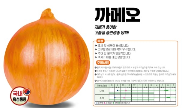 | 양파 | 슈페리어 | 권농종묘㈜ | 043-233-7479 | 구색이 진하고 내한성과 저장성이 우수한 중만생종 양파 |