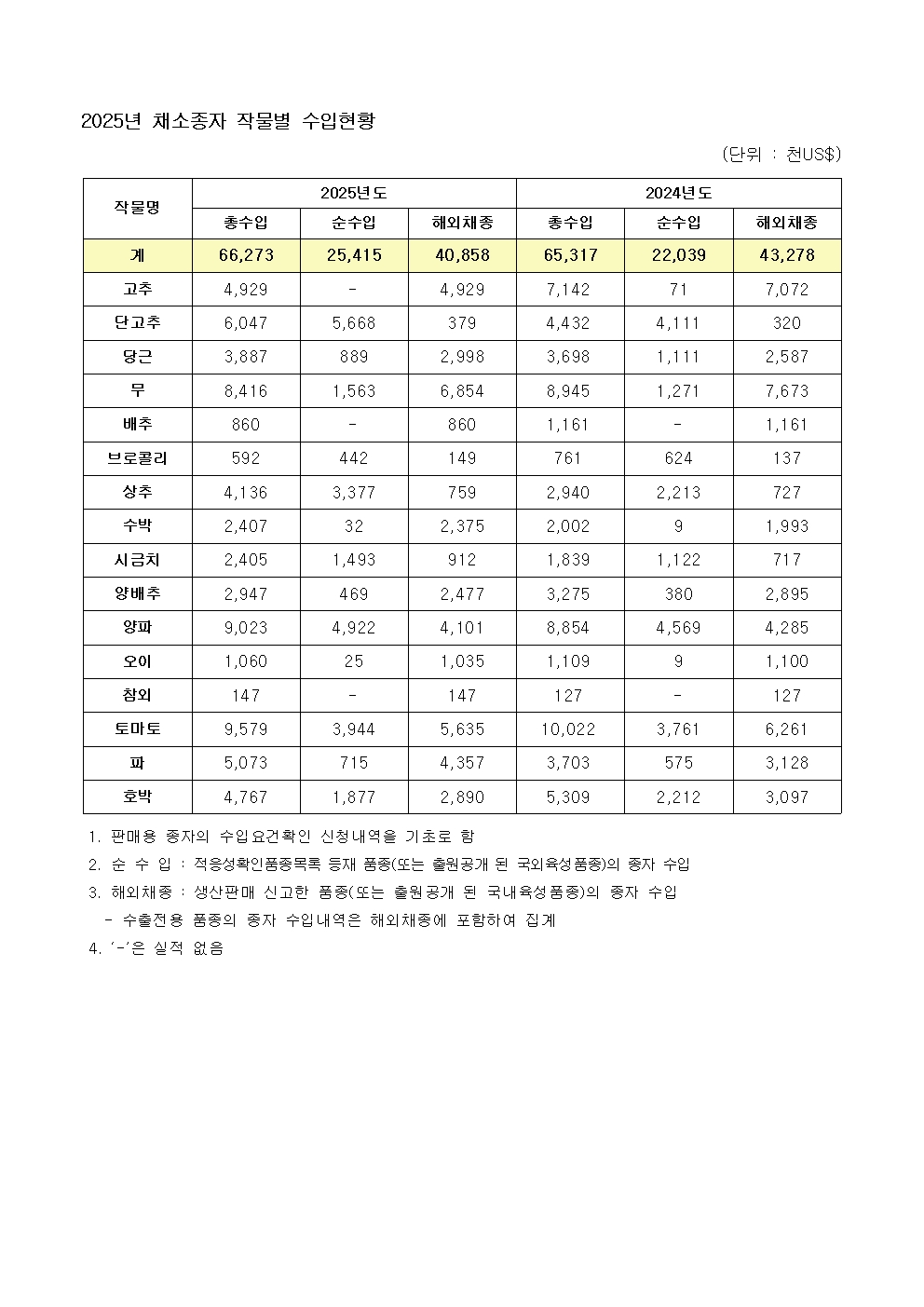 2025년도 채소종자 작물별 수입현황