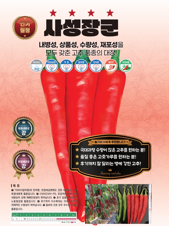 | 고추 | 사성장군 | 해성씨드플러스㈜ | 051-973-9697 | 내병성, 상품성, 수량성, 재포성을 모두 갖춘 고추 |