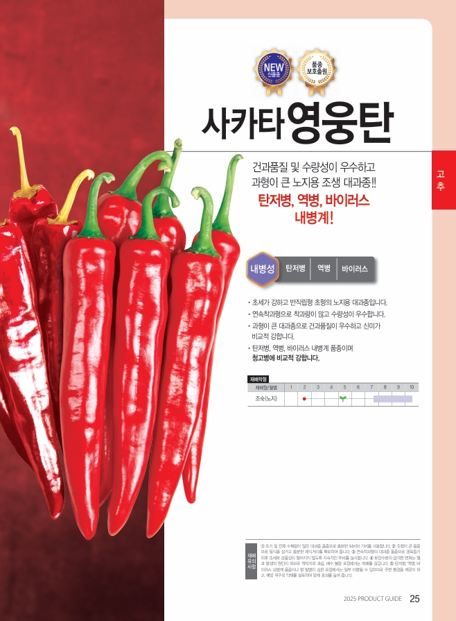 | 고추 | 사카타영웅탄 | 사카타코리아㈜ | 02-3474-6671 | 노지용 조생 극대과종, 탄저병 · 역병 · 바이러스 내병계 |