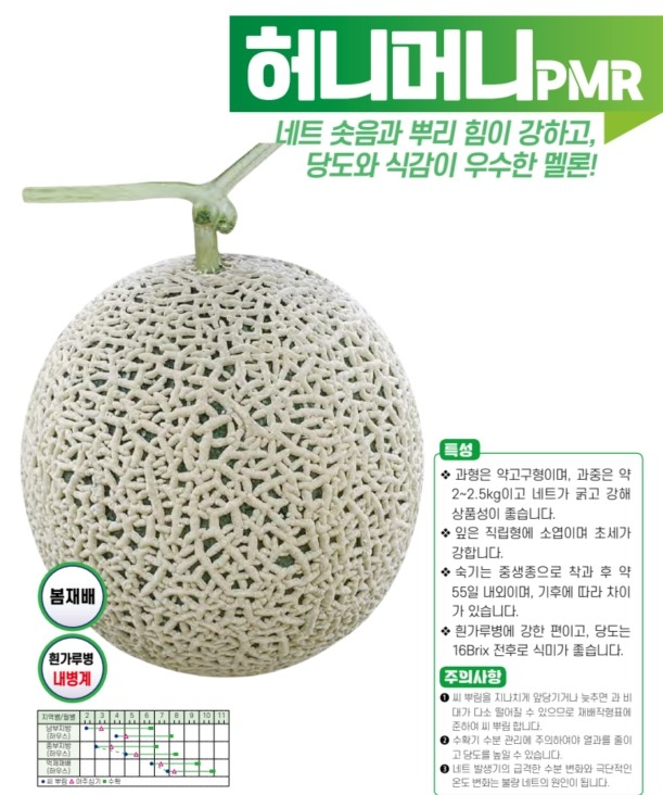 | 멜론 | 허니머니PMR | 아시아종묘㈜ | 02-443-4303 | 네트 솟음과 뿌리 힘이 강하고, 당도와 식감이 우수한 멜론! |