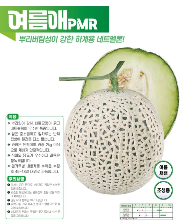 | 멜론 | 여름애PMR | 아시아종묘㈜ | 02-443-4303 | 뿌리버팀성이 강한 하계용 네트멜론! |