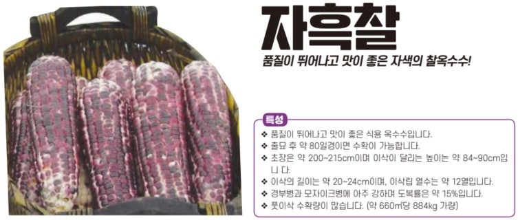 | 옥수수 | 자흑찰 | 아시아종묘㈜ | 02-443-4303 | 품질이 뛰어나고 맛이 좋은 자색의 찰옥수수! |