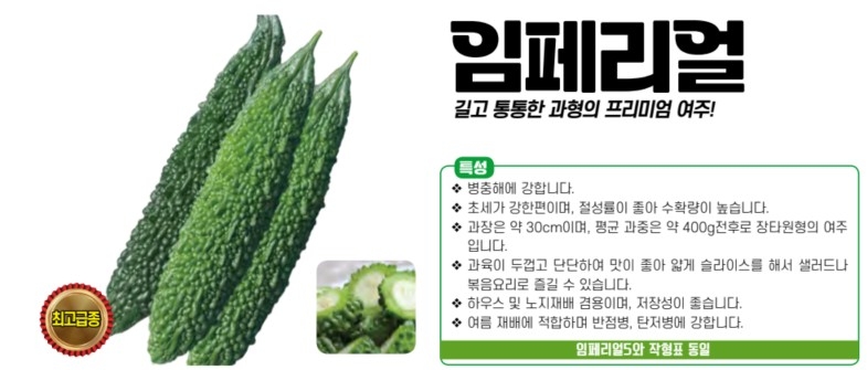 | 여주 | 임페리얼 | 아시아종묘㈜ | 02-443-4303 | 길고 통통한 과형의 프리미엄 여주! |