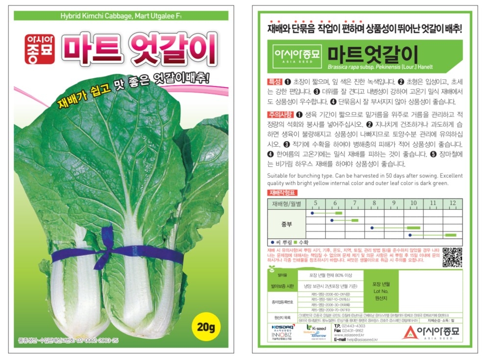 | 배추 | 마트엇갈이 | 아시아종묘㈜ | 02-443-4303 | 재배가 쉽고 맛 좋은 엇갈이배추 |