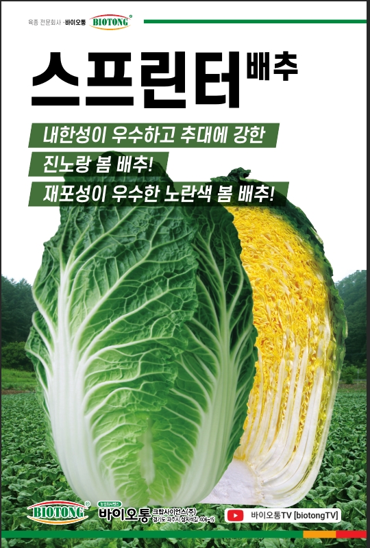 | 배추 | 스프린터 | 바이오통크랍사이언스㈜ | 031-994-4199 | 내한성이 우수하고 추대에 강한 진노랑 봄 배추 |