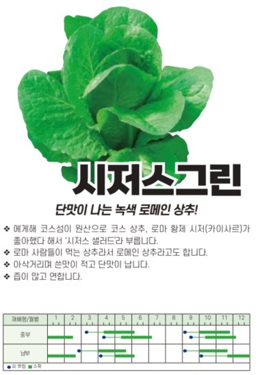 | 상추 | 시저스그린 | 아시아종묘㈜ | 02-443-4303 | 단맛이 나는 녹색 로메인 상추! |