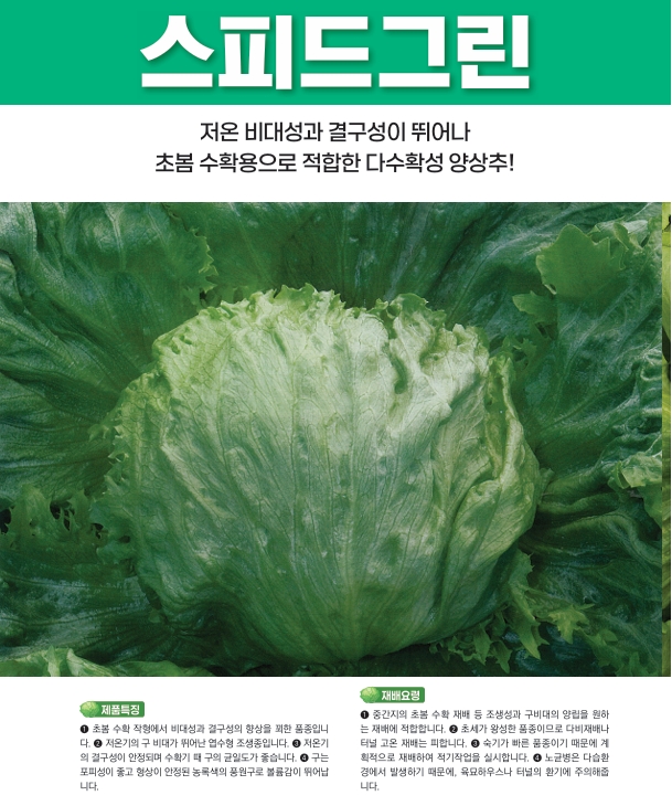 | 상추 | 스피드그린 | 해성씨드플러스㈜ | 051-973-9697 | 저온 비대성과 결구성이 뛰어나 초봄 수확용으로 적합한 다수확성 양상추 |