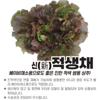 | 주요특성 | 베이비채소용으로도 좋은 진한 적색 쌈용 상추! |