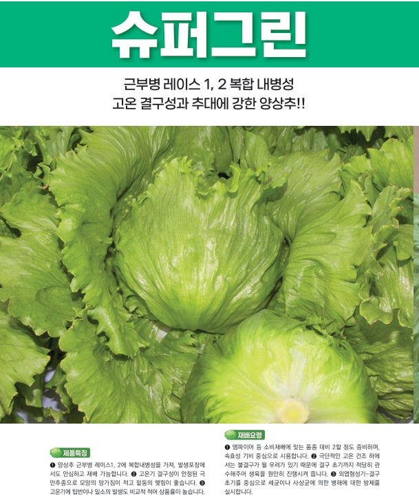 | 상추 | 슈퍼그린 | 해성씨드플러스㈜ | 051-973-9697 | 근부병 레이스 1,2 복합내병성! 고온 결구성과 추대에 강한 양상추 |