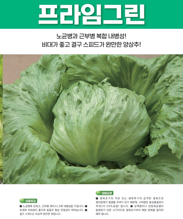 | 상추 | 프라임그린 | 해성씨드플러스㈜ | 051-973-9697 | 노균병과 근부병 복합 내병성! 비대가 좋고 결구 스피드가 완만한 양상추! |