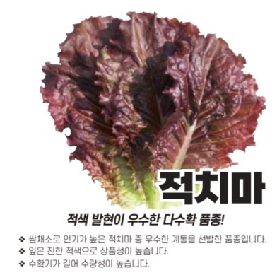 | 상추 | 신적생채 | 아시아종묘㈜ | 02-443-4303 | 베이비채소용으로도 좋은 진한 적색 쌈용 상추! |