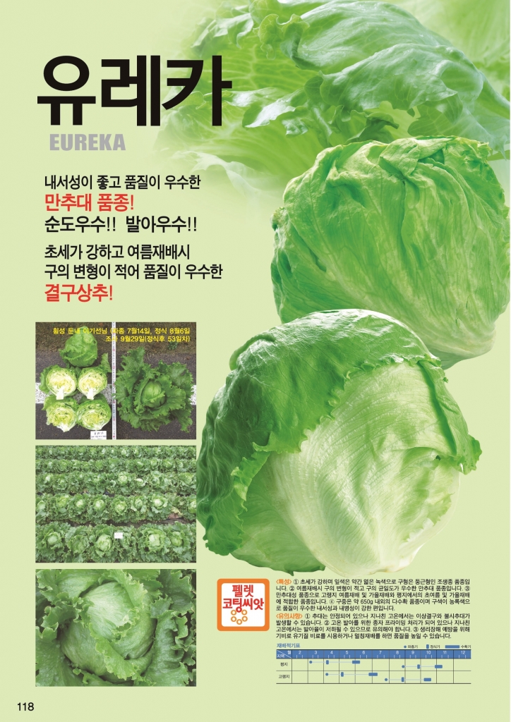 | 상추 | 유레카 | 권농종묘㈜ | 043-233-7479 | 내서성 좋고, 품질이 우수한 만추대 결구 상추 |