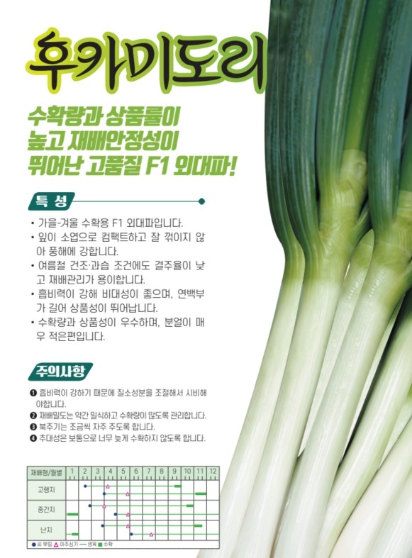 | 파 | 후카미도리 | 아시아종묘㈜ | 02-443-4303 | 수확량과 상품성이 높고 재배안정성이 뛰어난 고품질 F1 외대파! |