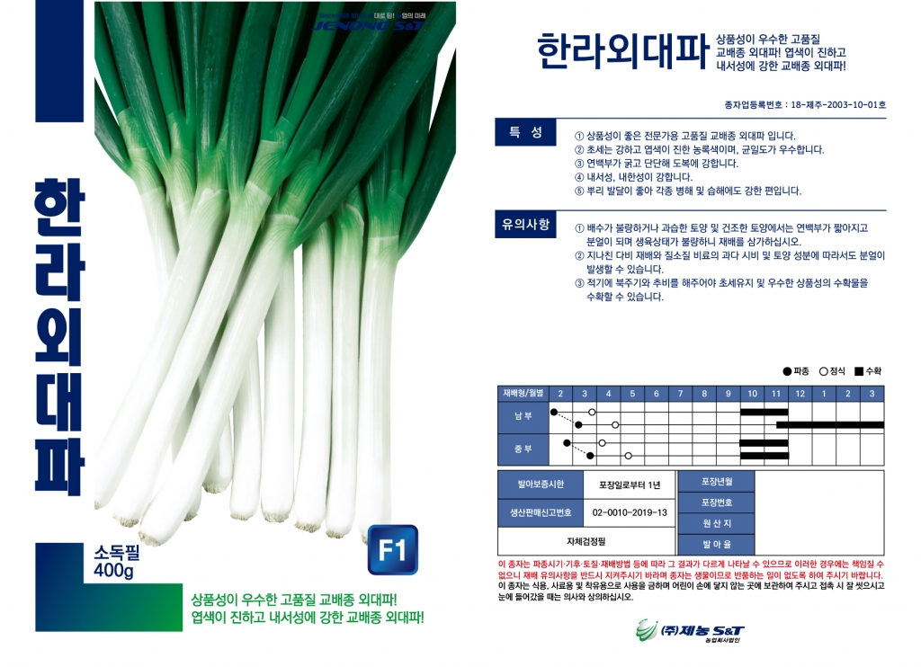 | 파 | 한라외대파 | ㈜제농S&T | 010-8506-0809 | 상품성이 우수한 고품질 교배종 외대파! 엽색이 진하고 내서력이 강한 외대파! |