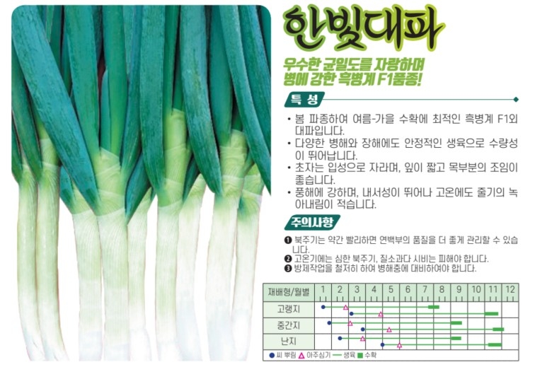 | 파 | 흥농만추일등 | ㈜팜한농 | 1644-0901 | 추대가 늦은 장열계 교배종! 수량성·재배 안정성이 우수한 F₁ 외대파! |