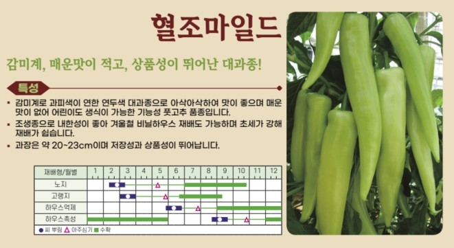 | 고추 | 혈조마일드 | 아시아종묘㈜ | 02-443-4303 | 감미계, 매운맛이 적고, 상품성이 뛰어난 대과종! |